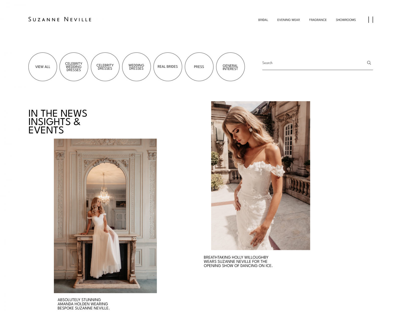 The end result is a stunning showcase marketing website that resonates with its target audience and has received praise from Suzanne Neville and customers alike. Of course it goes without saying that good photography and videography is an essential part of the Suzanne Neville experience.